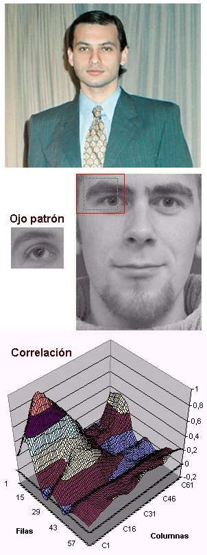 La correlación alcanza su mayor valor en el punto en el cual se localiza el ojo derecho en la imagen del rostro. Este mismo procedimiento puede generalizarse para localizar otros rasgos faciales (nariz, mentón, etc.).