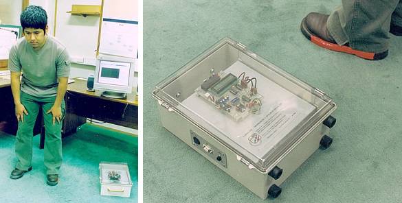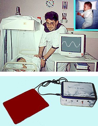 En 1996, Juan Pablo Varas exploró la posibilidad de detectar la respiración con un sensor de presión, recostando al infante sobre el sensor, tal como se observa en el recuadro superior derecho de la imagen. Se intentó fabricar un sensor con placas metálicas separadas por esponja (formando un capacitor), y con un cristal de cuarzo de bajo costo. Esta última alternativa resultó exitosa.