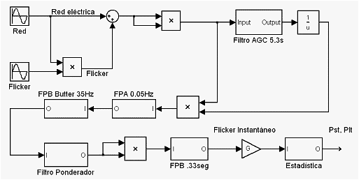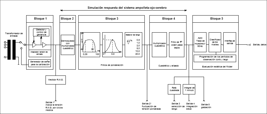 Para medir el flicker, se utiliza generalmente un sistema basado en el diagrama en bloques siguiente.