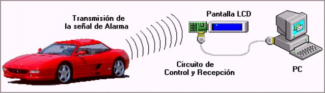 Se desarrolla un sistema de alarma a distancia para un vehículo estacionado. Si algún sensor detecta una condición anómala, el sistema transmite una señal de radiofrecuencia a un receptor equipado con una pantalla LCD, en la cual se despliegan detalles del evento. El receptor puede estar conectado a un PC vía puerta serial, en cuyo caso se presenta una ventana de advertencia en la pantalla y se emite una alarma acústica.