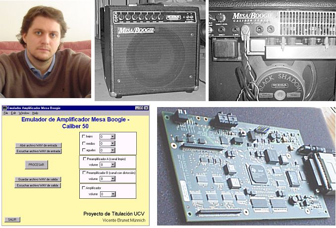 En primer lugar se mide la respuesta de frecuencia y la característica de transferencia no-lineal de un amplificador a tubos Mesa/Boggie (ver figura), para diferentes posiciones de los controles del panel frontal. Luego se diseña un sistema de procesamiento basado en filtros digitales y sistemas digitales no-lineales que se comportan en forma similar al amplificador usado como modelo.